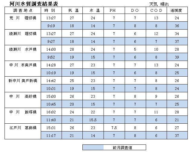 綾瀬川 水の色 茶褐色で濁っている 水戸橋上流風景 ごみなし 新奥戸橋 測定結果 新奥戸橋 採水状況 高根さんも 体験 江戸川 葛飾橋調査状況 江戸川 新緑の川辺