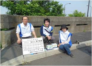 5月24日 レインボーホールにて総会 6月10日 葛飾区環境・緑化フェアー参加 7月15日 堀切橋下にて試薬にて水質調査 荒川、綾瀬川、中川、新中川、江戸川 定期水質調査 中川 高砂橋採水状況